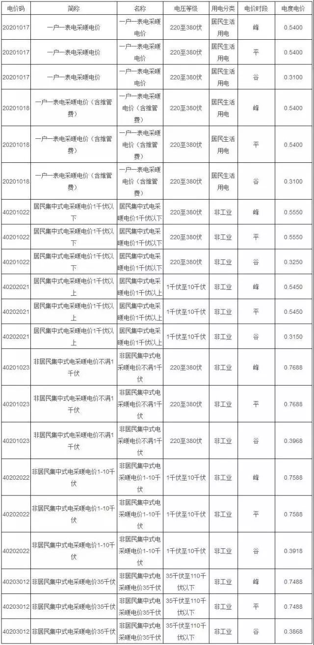 居民集中式電采暖用戶,非采暖期用電恢復執行相應電壓等級居民生活合表用電電價;同時,不執行峰谷分時電價,電能表時段與采暖期保持一致、不再調整。